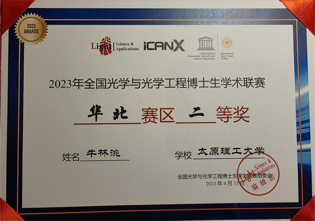 414-16日,德赢官网张明江教授指导的2022级光学工程博士生牛林洮同学在2023年全国光学与光学工程(华北赛区)博士生学术联赛荣获第三名、斩获二等奖。